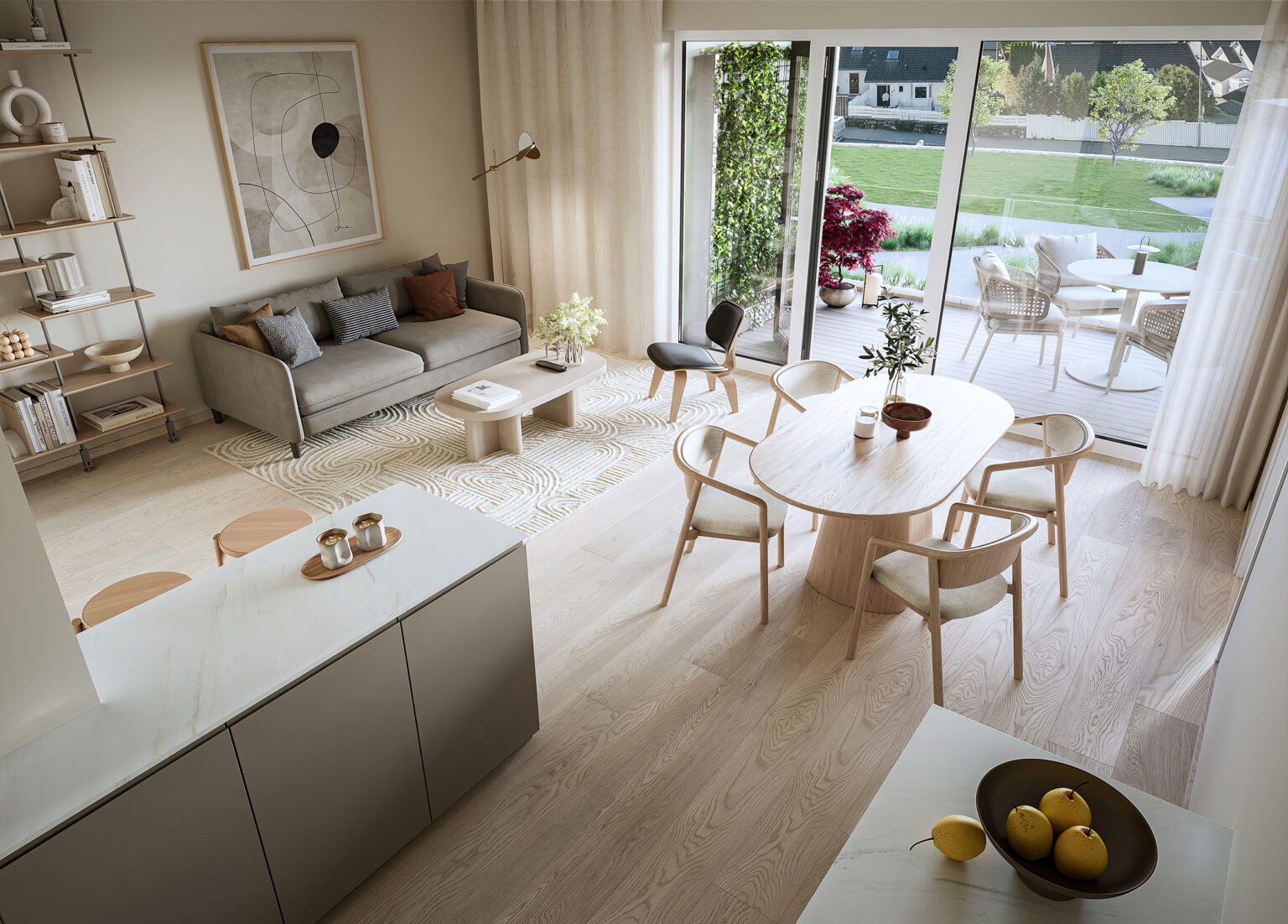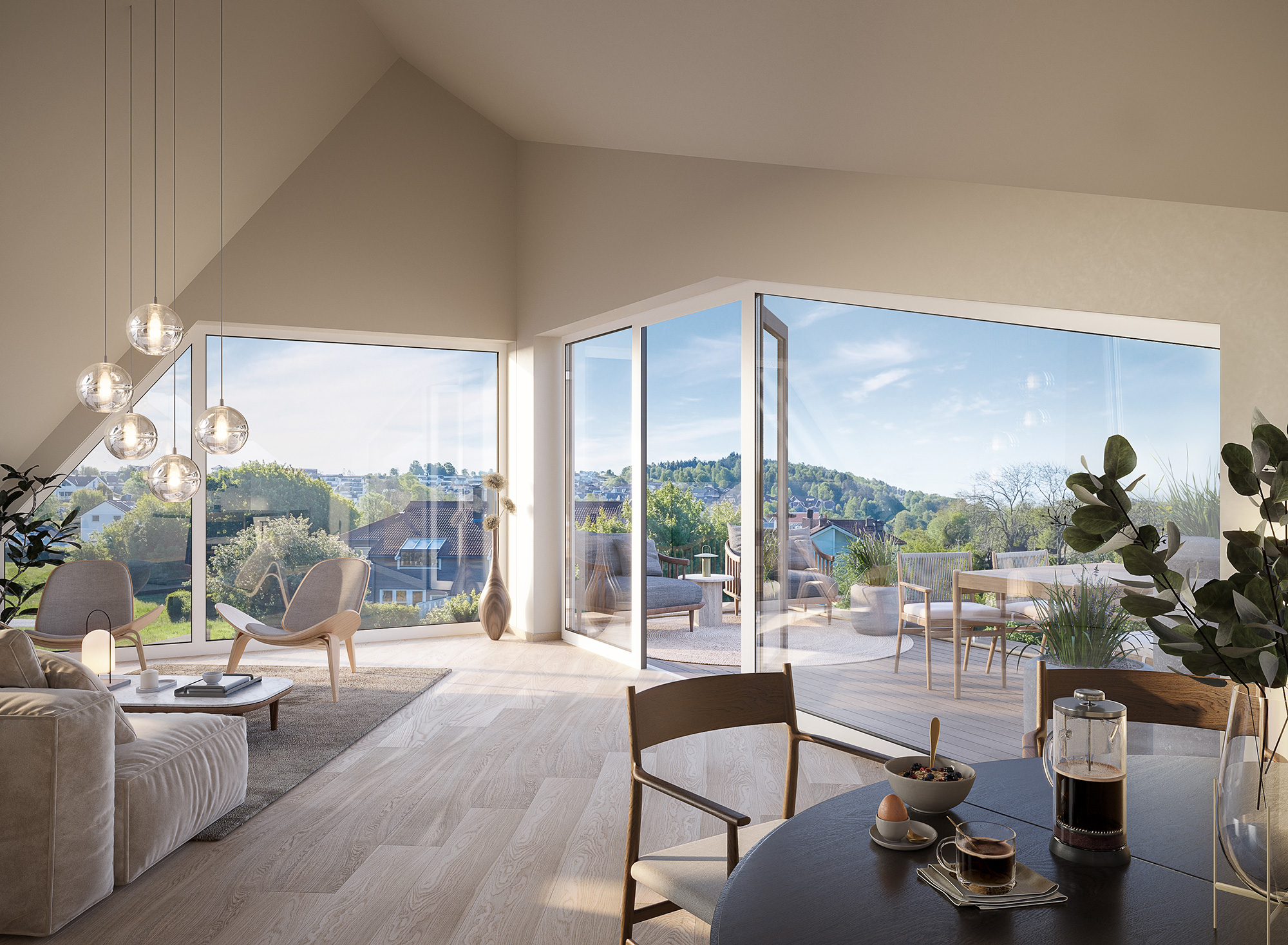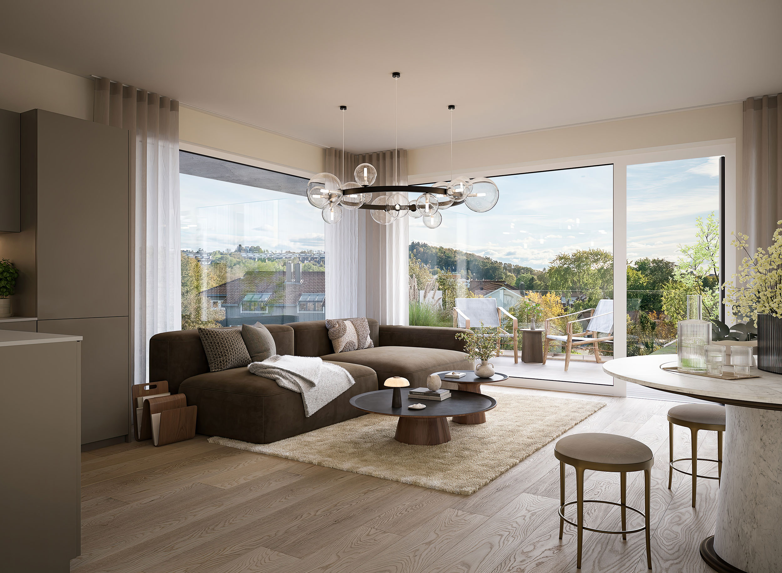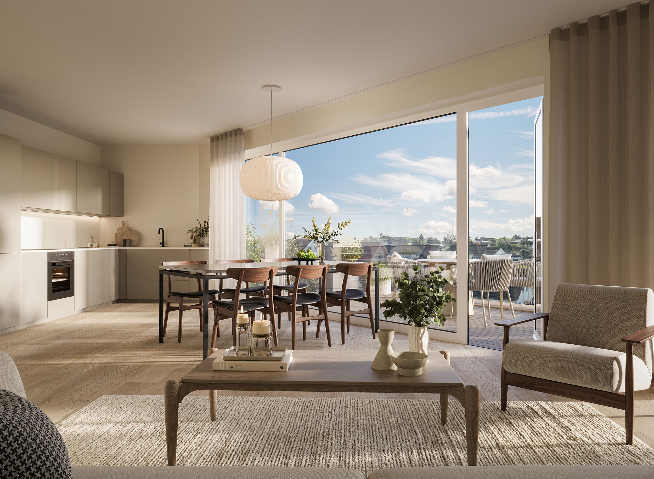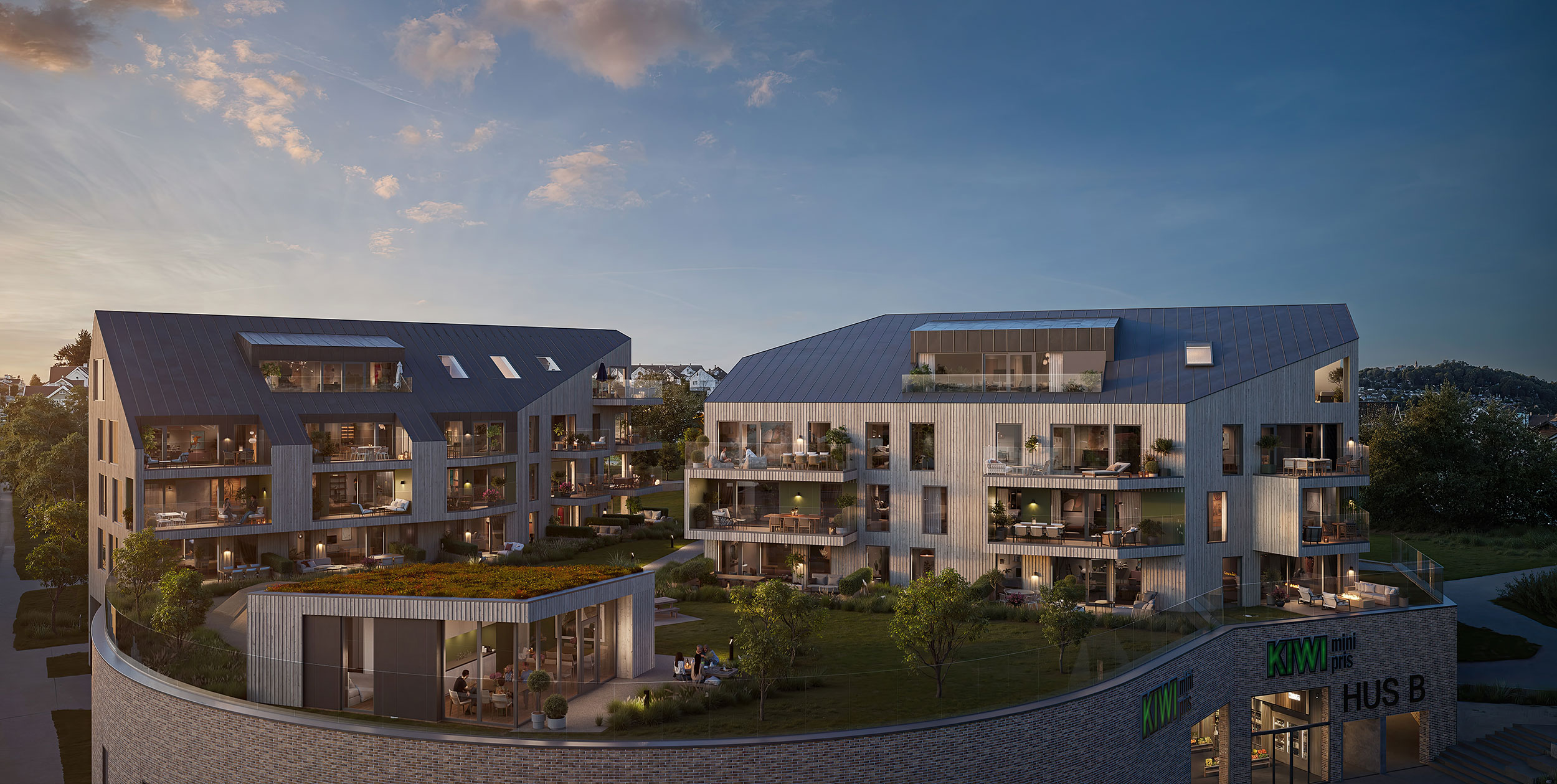 Her bor du høyt og fritt, med gode solforhold, flott utsikt og direkte tilgang til grønne fellesarealer som naturlig kobles til nærliggende turveier og parkdrag. Leilighetene bygges i to bygg med lune uteområder mellom, tilrettelagt med felleshus, gjestehybel og selskapslokale for et sosialt og levende bomiljø.